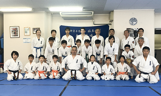 2023年1月22日(日) 静岡市北部体育館 5都県から、約130名が参加。大石範士の指導の下、準備運動 から基本稽古、型、組手と、4時間以上の稽古を、下は4才から 上は70代までの道場生が、寒風を吹き飛ばす気迫で行いました。 稽古を終えて 範士を囲んで 参加した約40名の黒帯 型全日本チャンピオン日下部尚人(中央)・野澤歩生(右) などによる征遠戦 |